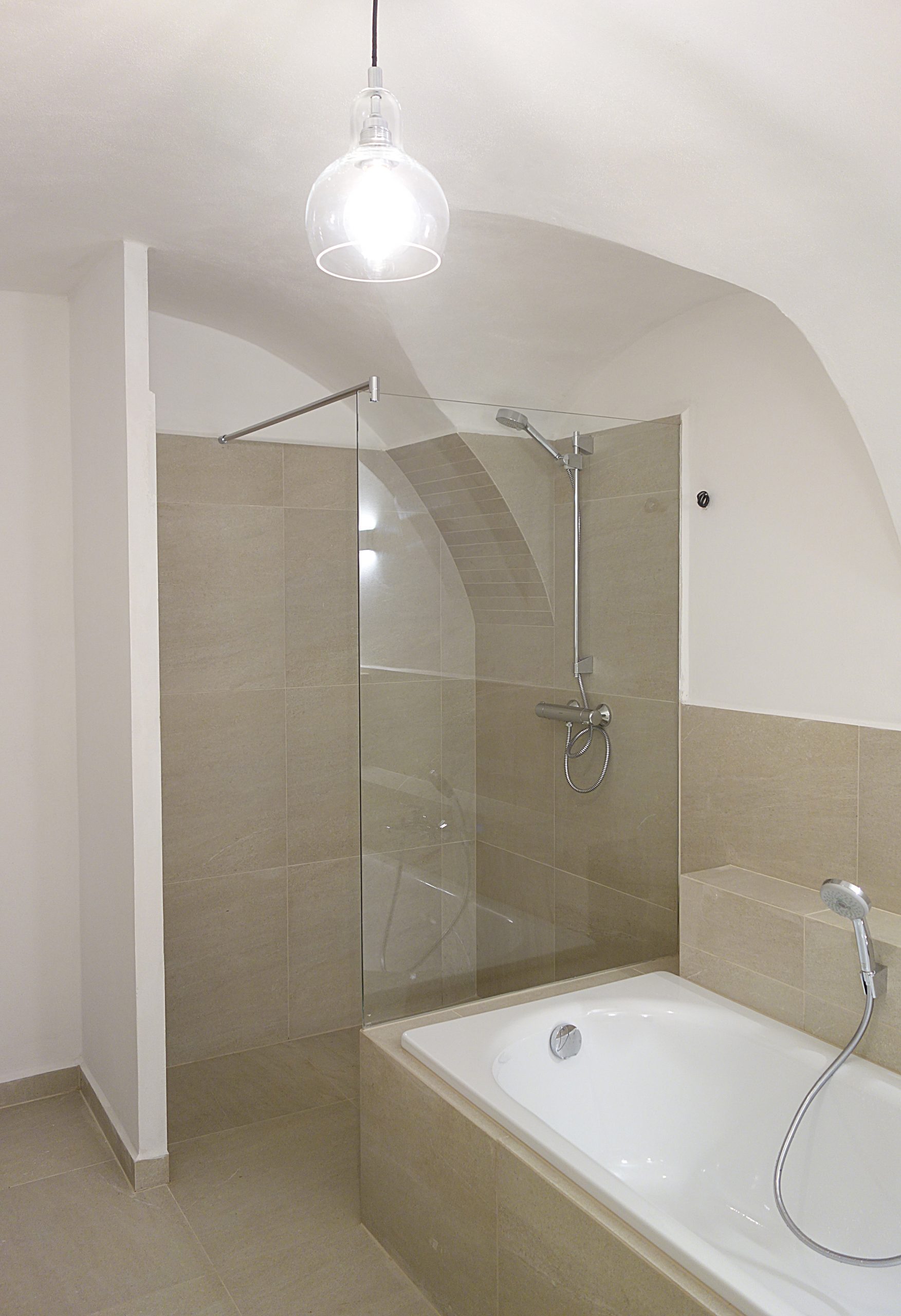 Koupelna je opatřena standartním vybavením a nadčasovým obkladem.